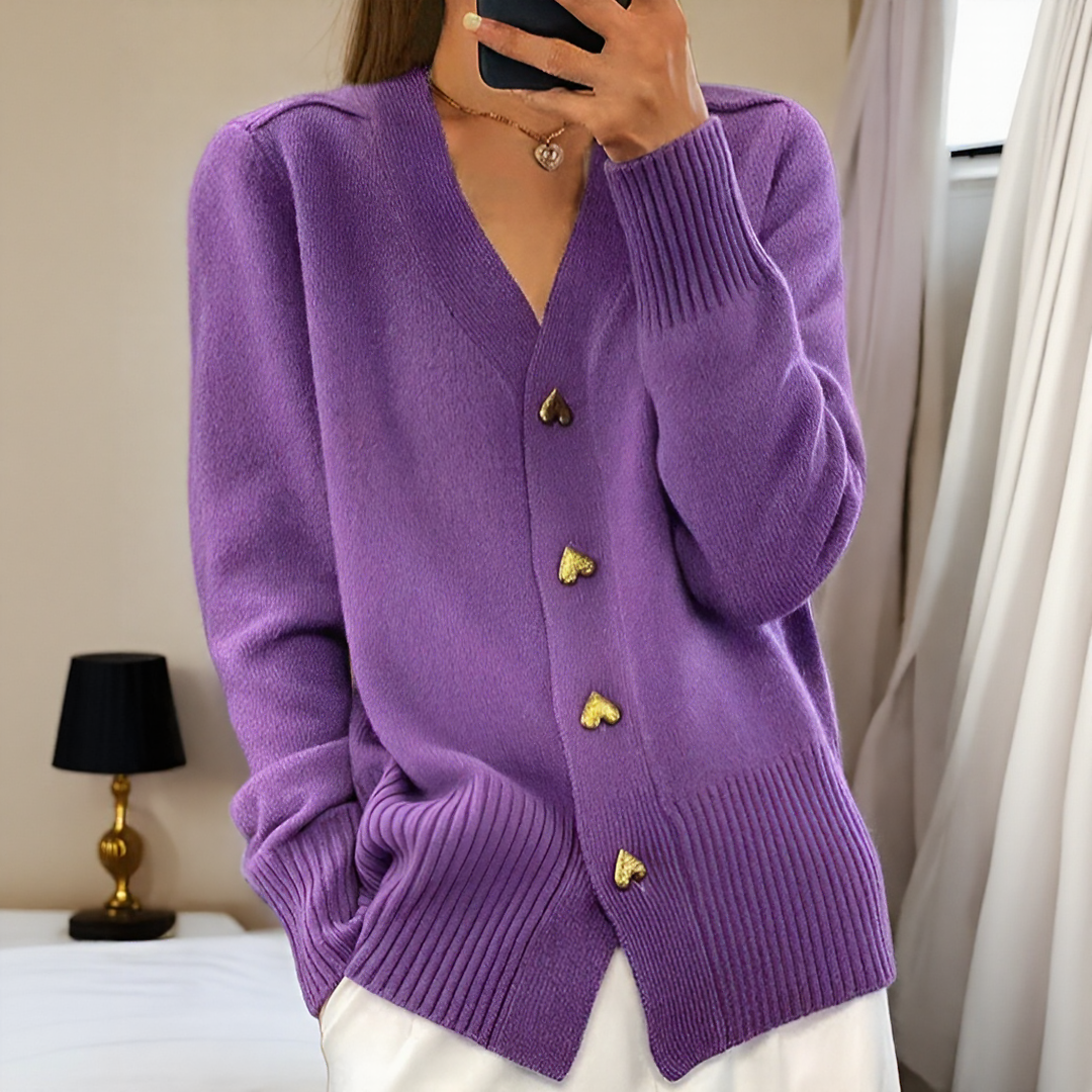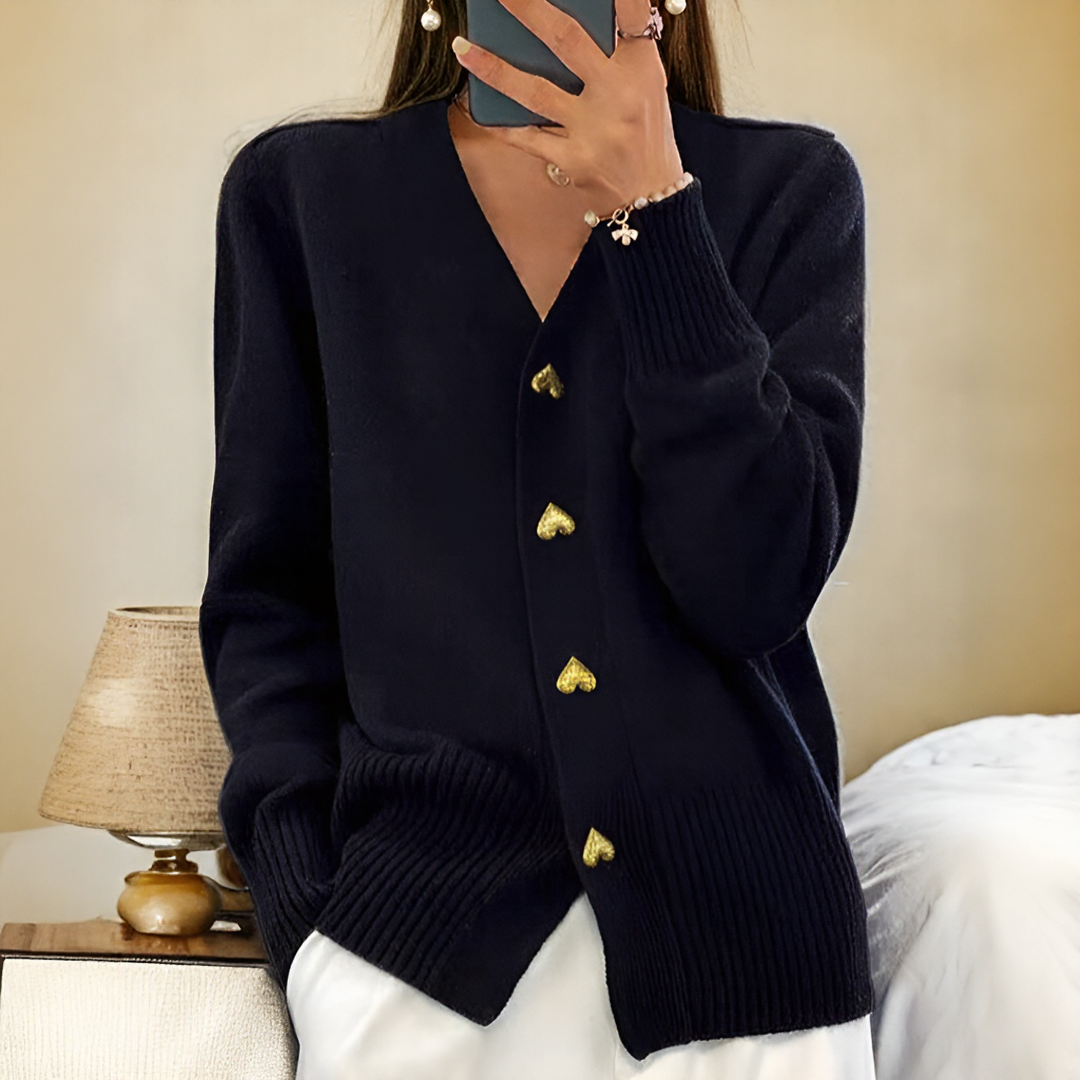 Elegant och bekväm cardigan i ull och kashmir. Hjärtformade knappar för en raffinerad touch. Slimmad passform med V-hals och ribbade kanter. Finns i flera färger.